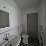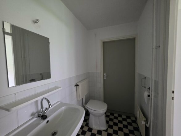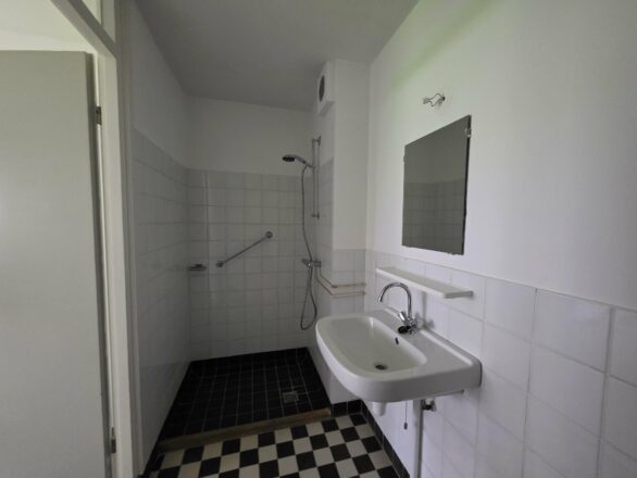 De badkamer is voorzien van douche met mengkraan en wastafel met planchet, tevens bevindt zich hier het toilet.