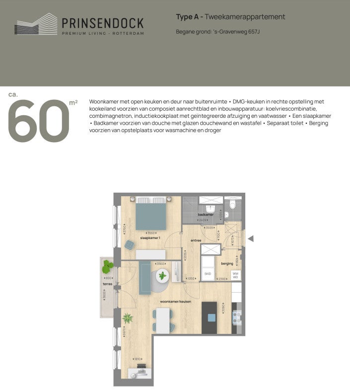 De keuken is uitgerust met een kookplaat met ingebouwde afzuigkap, vaatwasser, koelkast, combi oven en koelkast. De badkamer is uitgerust met een inloopdouche, wastafel met meubel, spiegel en handdoekradiator.