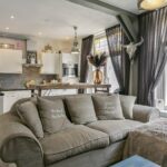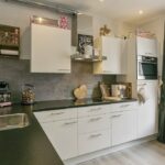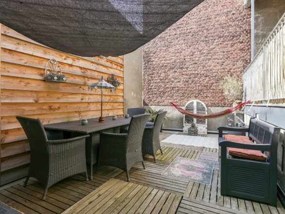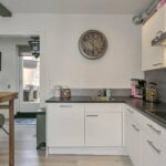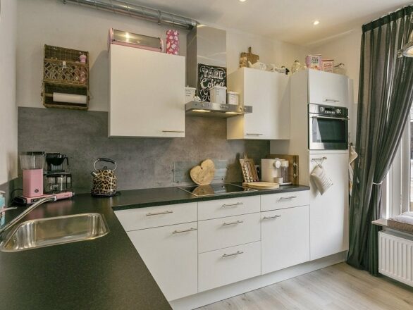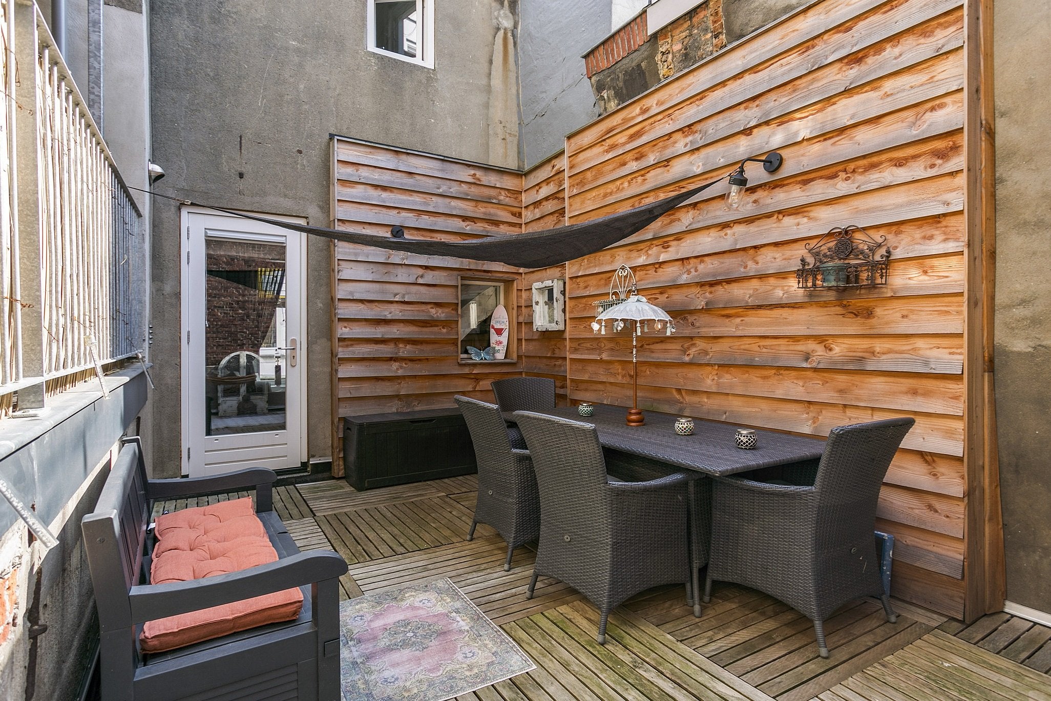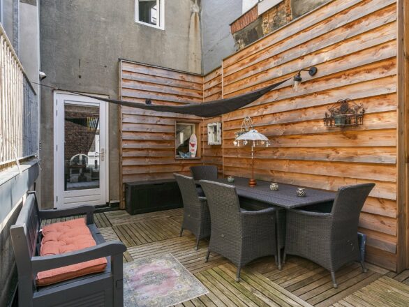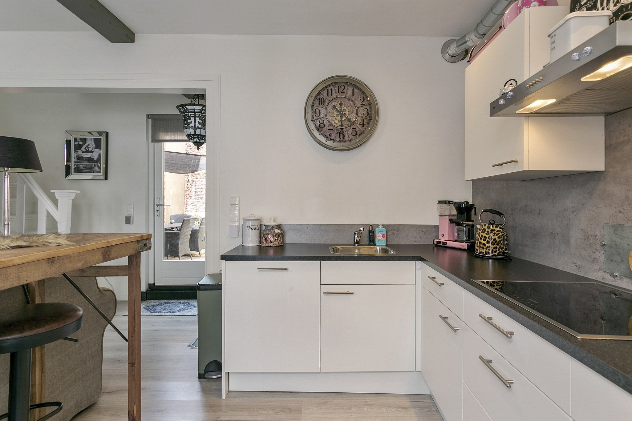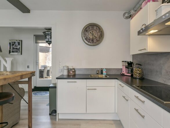 Vanuit het tussenbordes ( met toilet/fonteintje) is de woonkamer bereikbaar met toegang tot de sfeervolle binnenplaats (met verlichting). De L-vormige moderne keuken heeft o.a. een vaatwasser, boiler, inductie kookplaat, rvs-schouwkap, combioven en koeler (met vriesvakje).