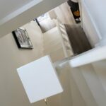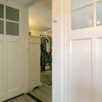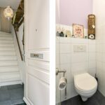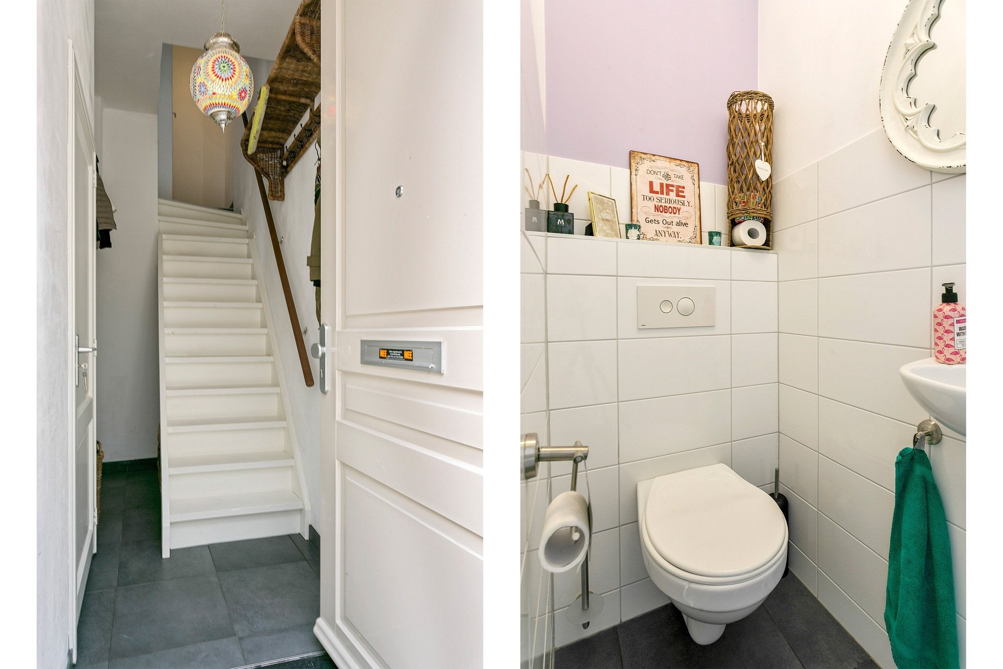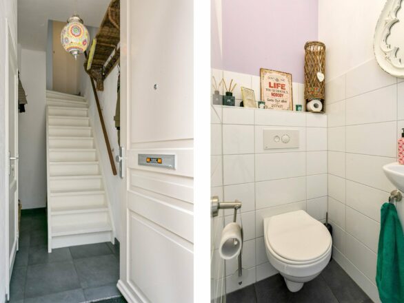 De bovenwoning heeft een eigen opgang met meterkast en plaats voor een fiets. Trap naar tussenbordes met toiletruimte.