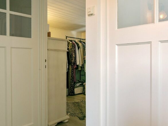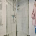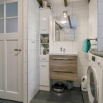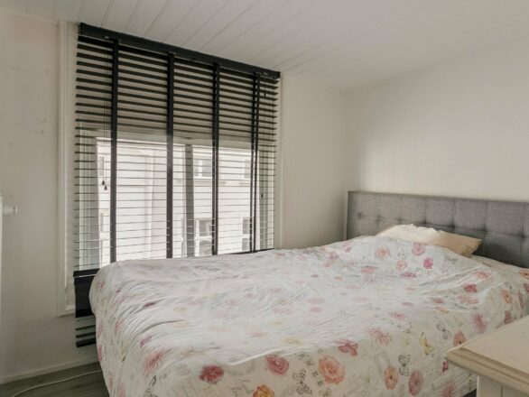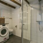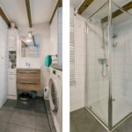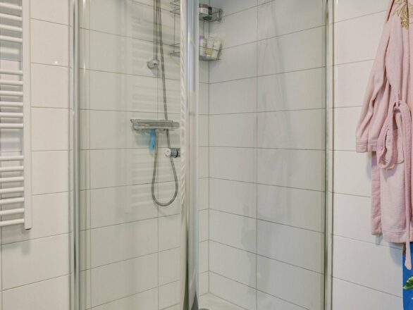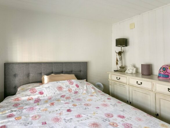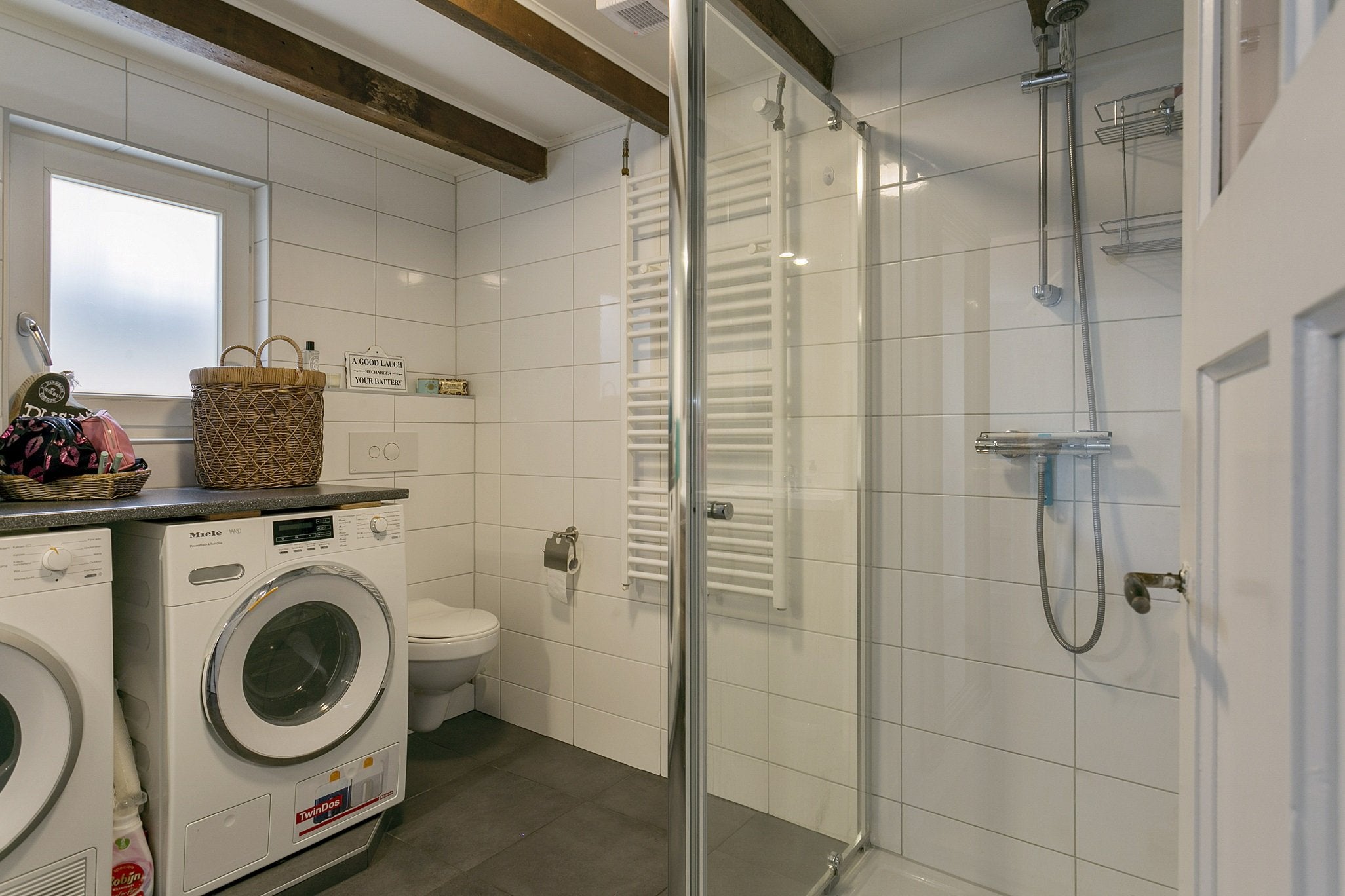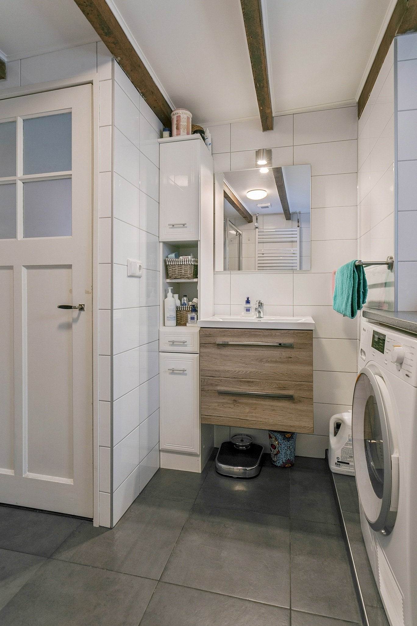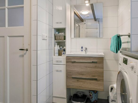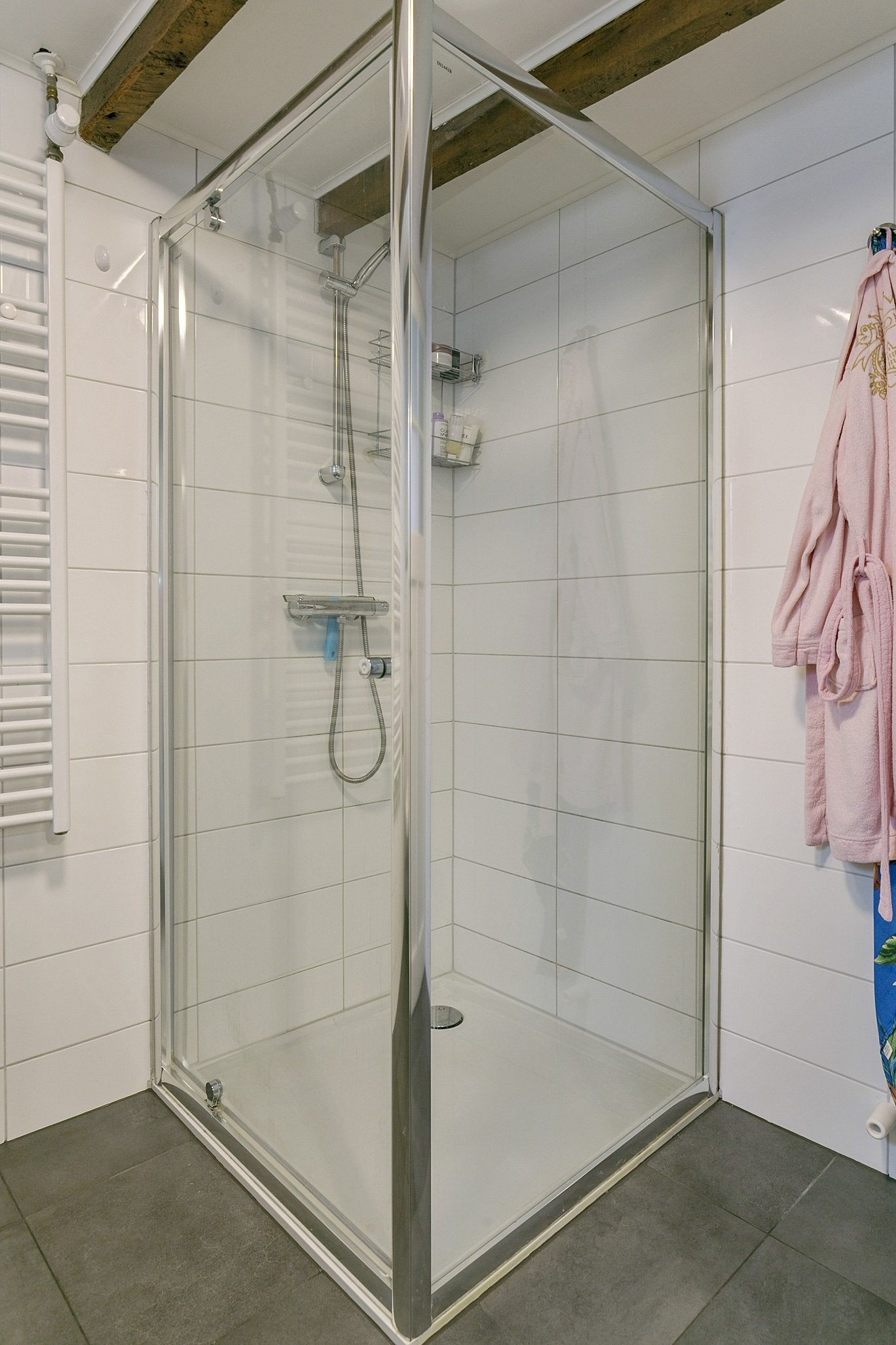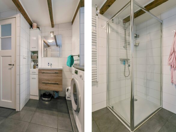 Overloop met grenenhouten plankenvloer, stucwerk en kraaldelenwanden/plafond. De cv-combiketel is netjes verwerkt in een ombouwkast. Vervolgens zijn er twee slaapkamers (2,48×2,7m) en een moderne badkamer met douchecabine, wastafelmeubel, tweede toilet en plaats voor een wasmachine en condensdroger.