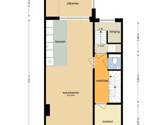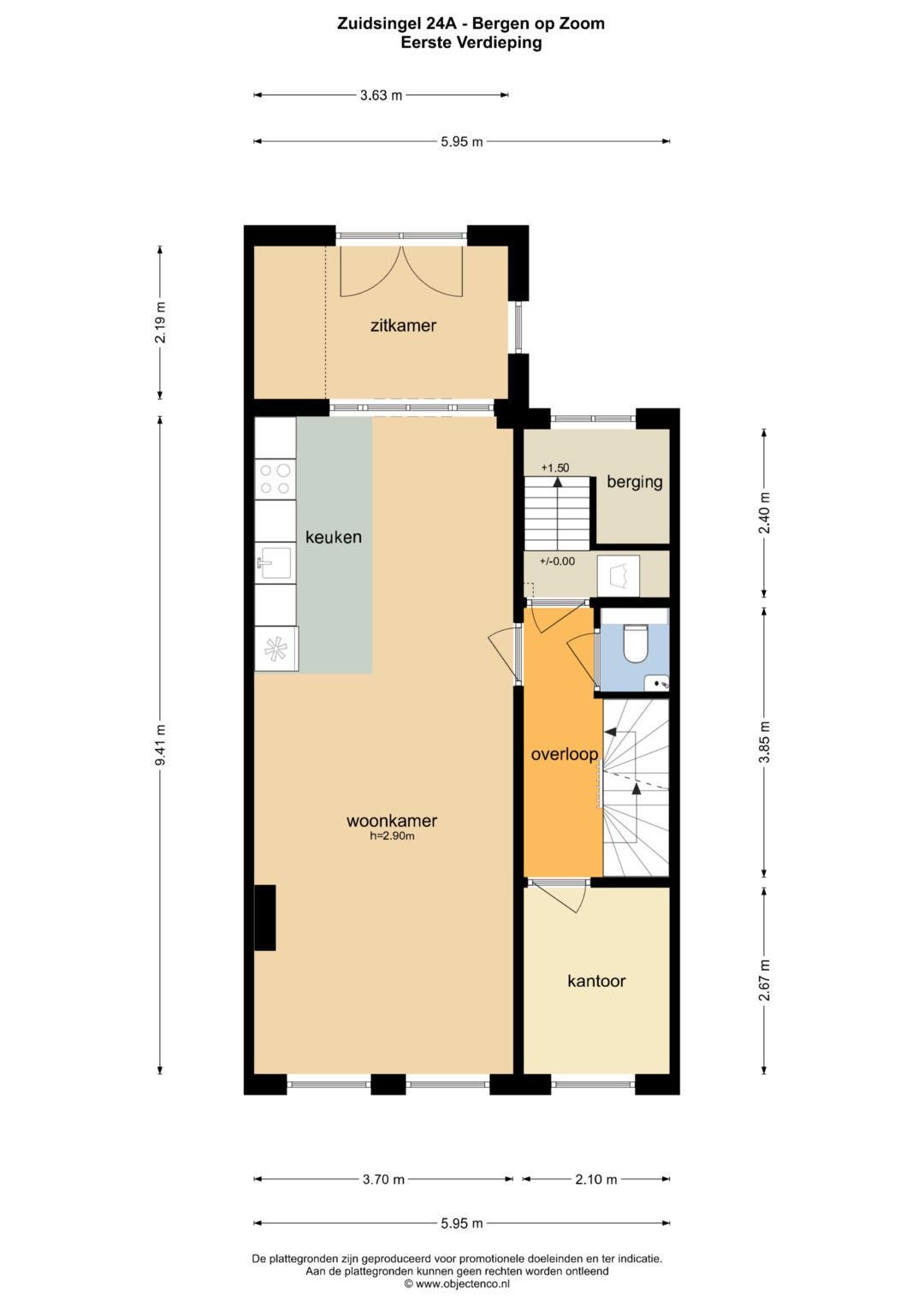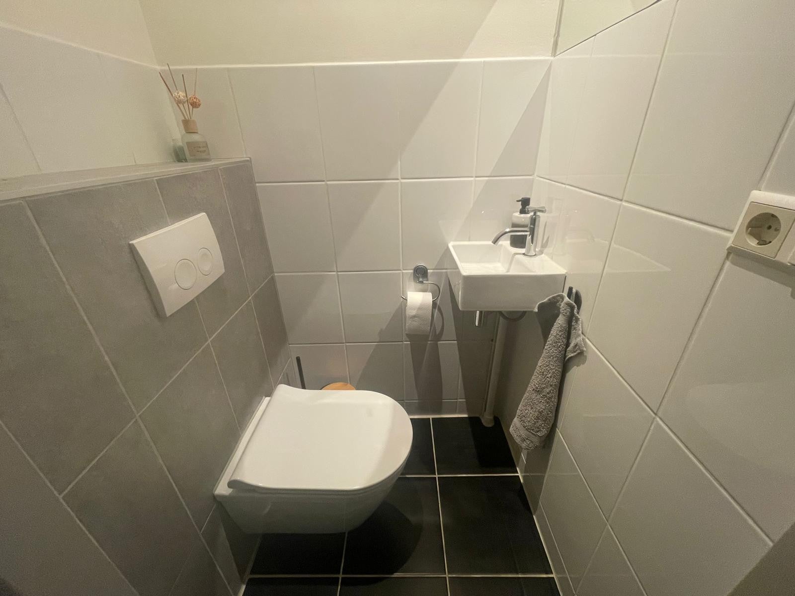 Via de vaste trap komt u op de eerste verdieping waar zich de royale woonkamer met open keuken, het toilet en een extra (werk)kamer bevinden. Ook zit hier in een aparte ruimte de aansluiting voor het wasmachine.