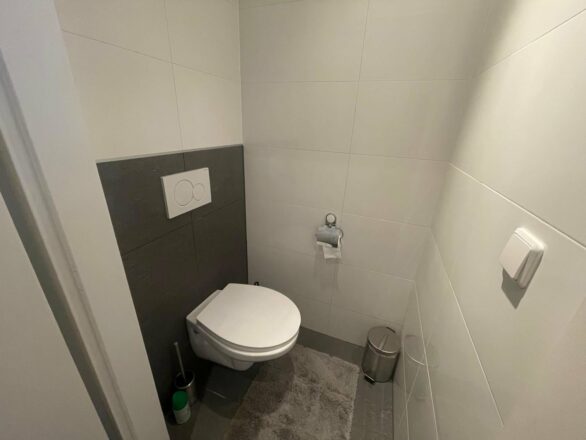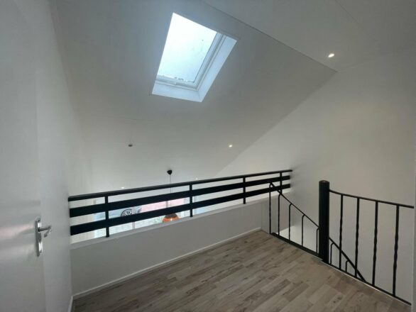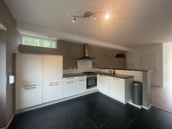 De woonkamer met open keuken van maar liefst 50m² biedt een royale leefruimte met veel lichtinval. Hier creëert u eenvoudig een gezellige zithoek en eetgedeelte waar u heerlijk kunt ontspannen en gasten kunt ontvangen. De keuken is uitgerust met een gas kookplaat, vaatwasser, afzuigkap, vriezer, koelkast, oven en een praktische mengkraan.