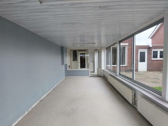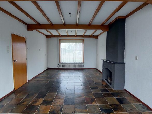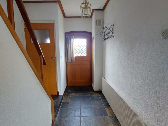 U word ontvangen in de ruime entree, hier vind u de toegang naar keuken, woonkamer, bergkast en toilet. De woonkamer is voorzien van een tegelvloer en gezellige haard. De aparte keuken is voorzien van koelkast, gasfornuis en afzuigkap. Vanuit de keuken heeft u toegang tot de lichte royale uitbouw en bijkeuken.