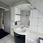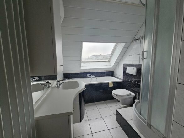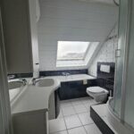 De badkamer is compleet ingericht met een ligbad, douche, wastafel in meubel en een vrijhangend toilet.