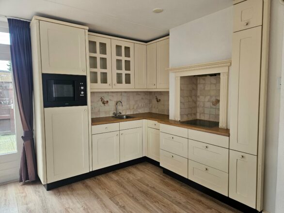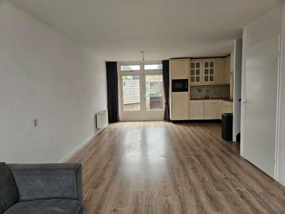 De doorzonwoonkamer is ca. 33 m² en staat in open verbinding met de keuken. De keuken is voorzien van een inductiekookplaat met afzuiging, een combi-magnetron en een koelkast.