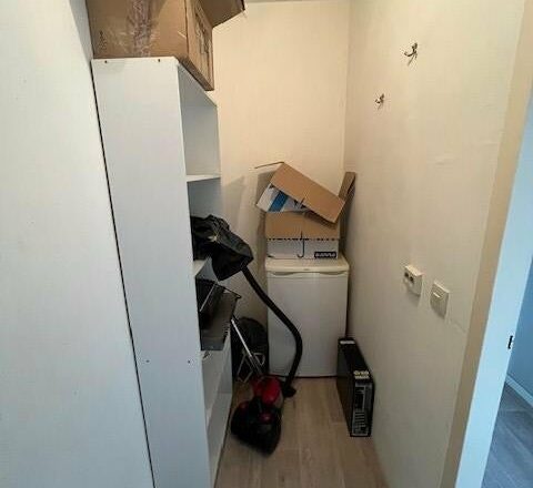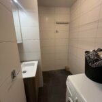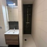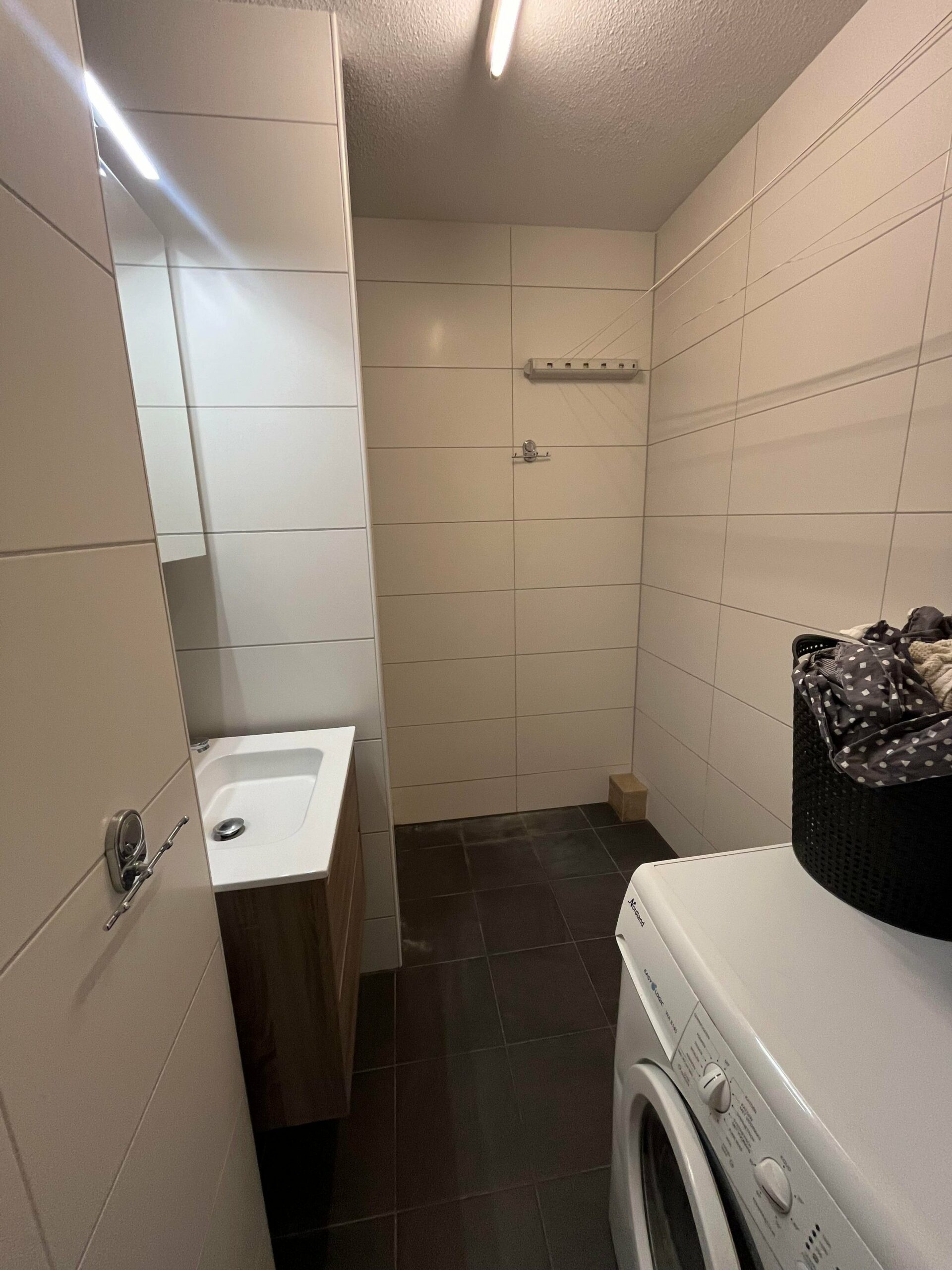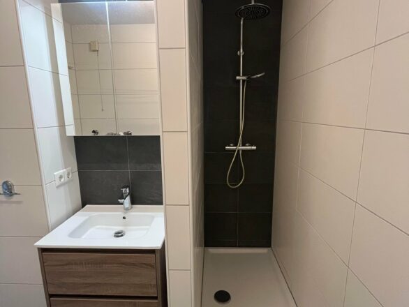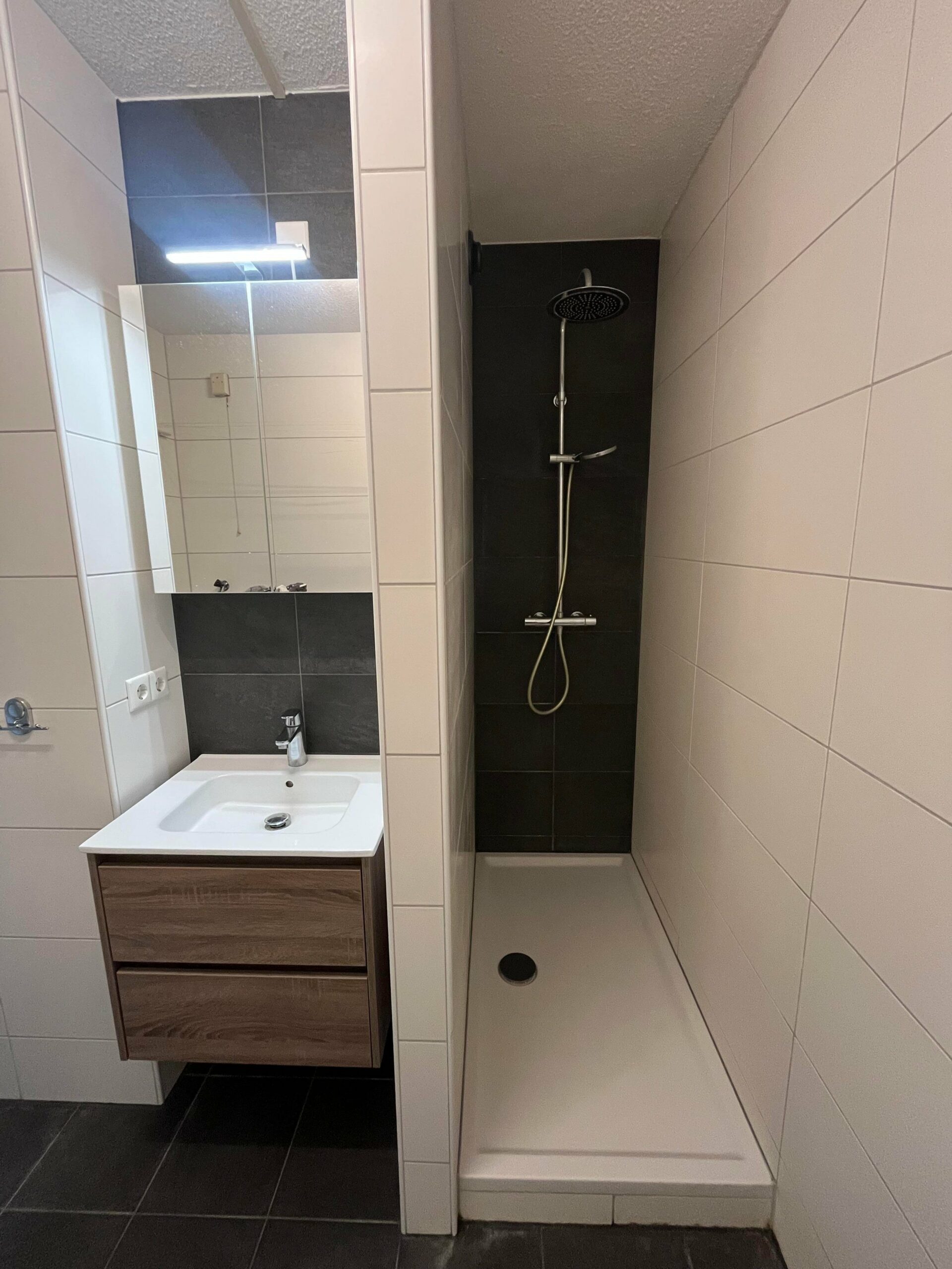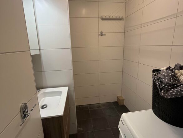 Vanuit de hal bereik je de tweede slaapkamer en de badkamer. De badkamer is voorzien van een badkamermeubel met wastafel, een douche en de aansluiting voor de wasmachine.