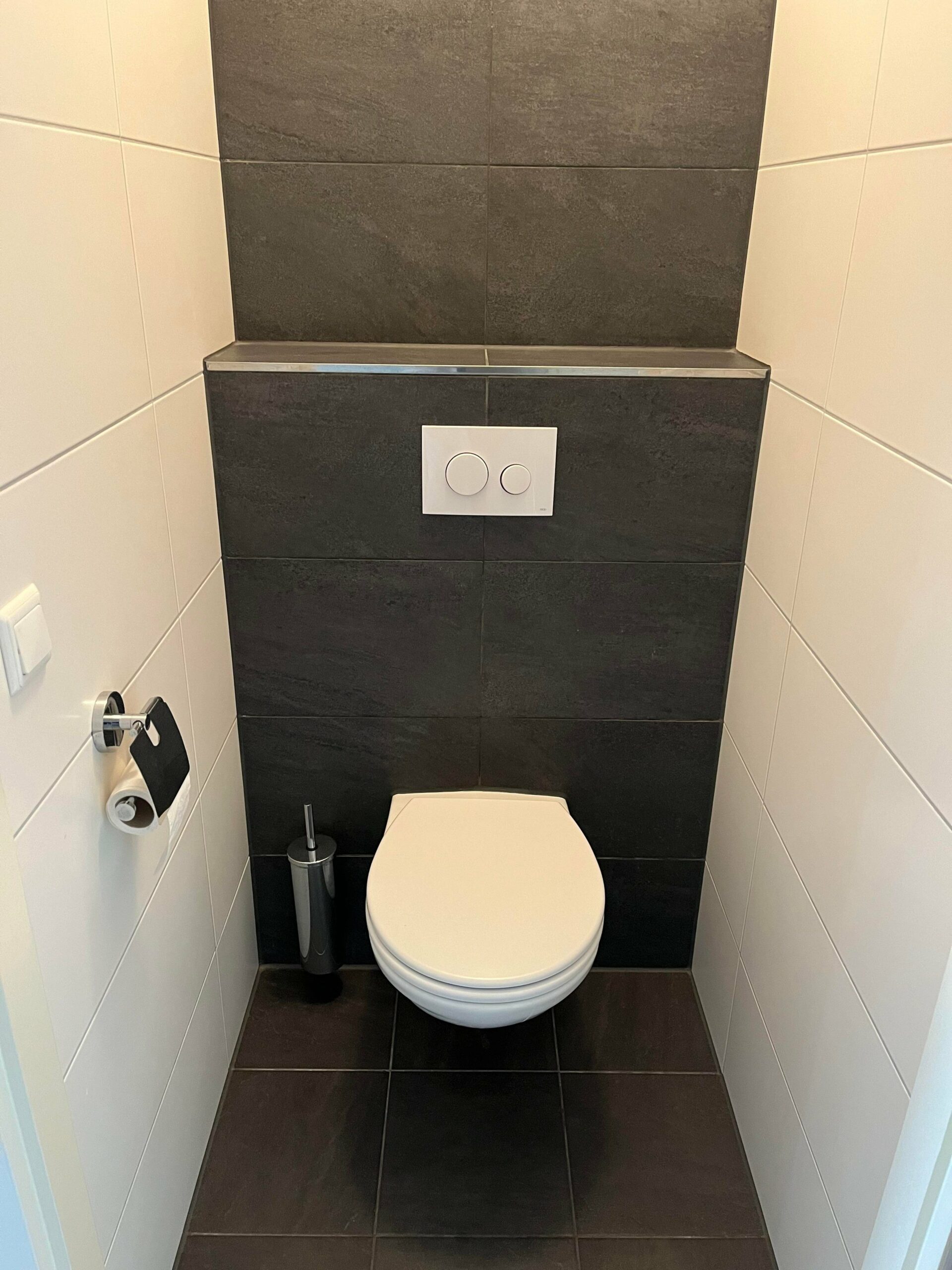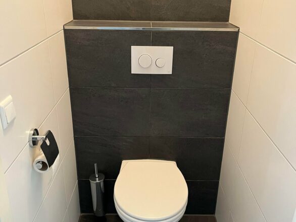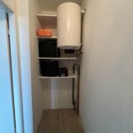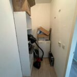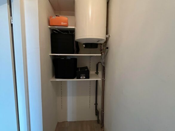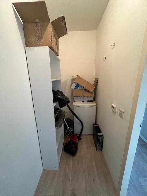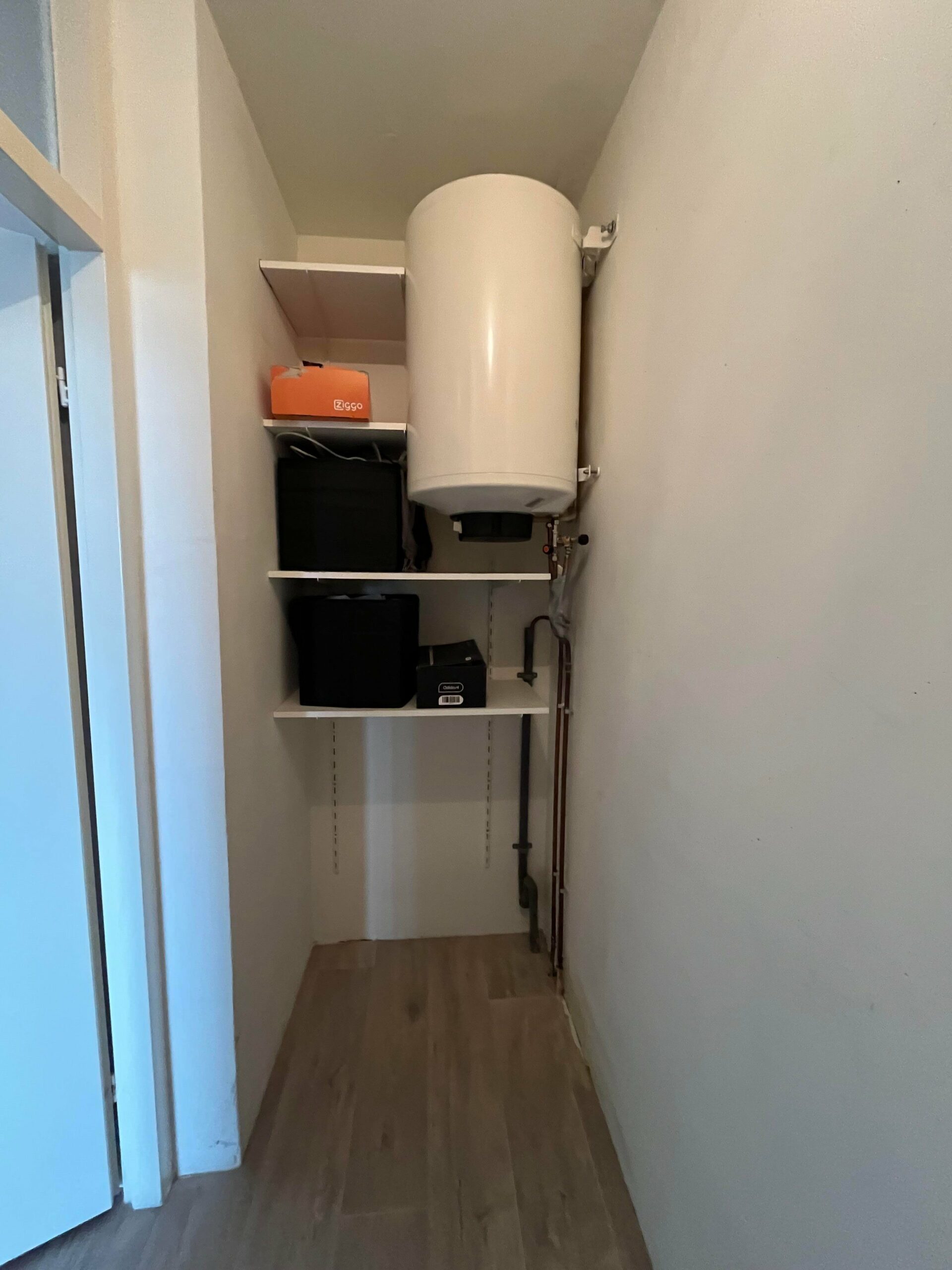 Vanuit de hal bereik je de tweede slaapkamer en de badkamer. De badkamer is voorzien van een badkamermeubel met wastafel, een douche en de aansluiting voor de wasmachine.