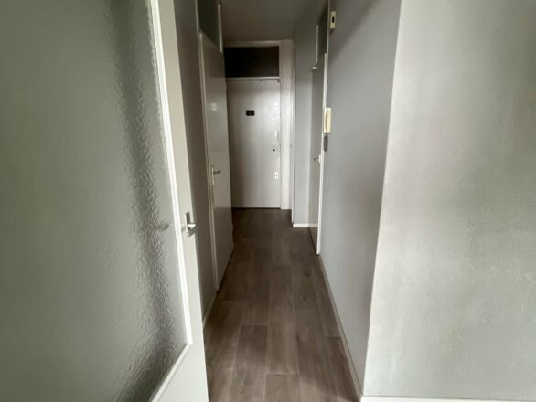 Via de hal bereik je het toilet, de meterkast, de badkamer, de slaapkamer en de woonkamer.