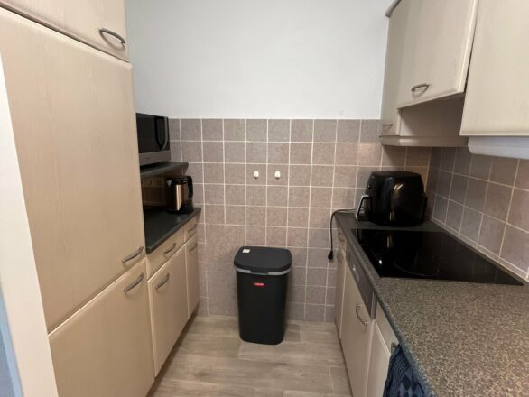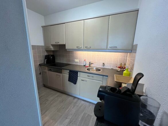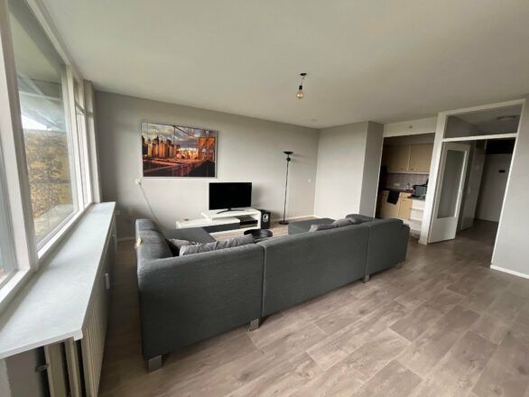 De sfeervolle woonkamer is voorzien van een halfopen keuken met inbouwapparatuur, zoals een kookplaat met afzuiging, koelkast met vriesvak en een vaatwasser. Via de woonkamer bereik je de slaapkamer en het balkon met een mooi uitzicht.