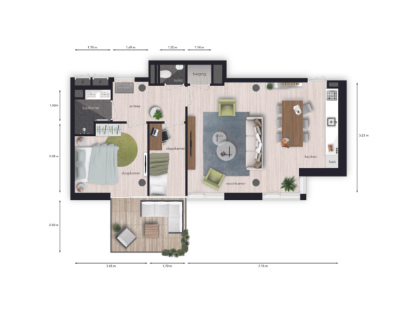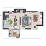 Bij binnenkomst in het appartement bereikt u via de hal de ruime woonkamer met open keuken, de twee slaapkamers, het separate toilet en de badkamer. Tevens beschikt het appartement over een bergruimte waarin de wasmachineaansluiting zich bevindt. De keuken is uitgerust met een kookplaat en afzuigkap. De badkamer is luxe afgewerkt en beschikt over een tweetal wastafels. Vanuit de woonkamer heeft u toegang tot het ruime balkon met uitzicht op de binnentuin.