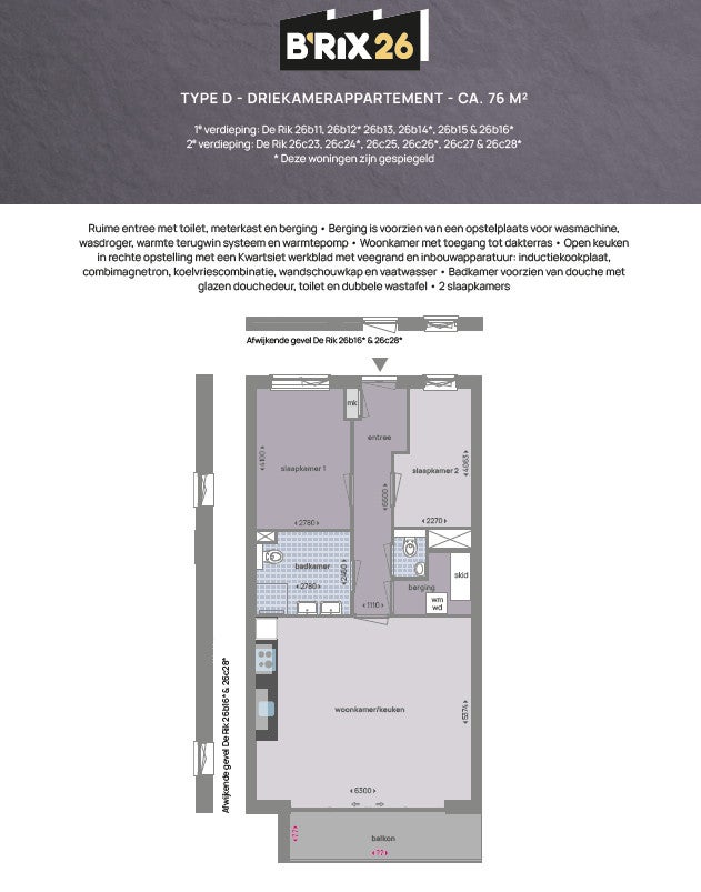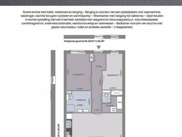 De berging is voorzien van een opstelplaats voor wasmachine, wasdroger, warmte terugwin systeem, warmtepomp en boiler. Bij de woonkamer heeft u toegang tot het balkon. Er is een open keuken met een Kwartsiet werkblad met veegrand en inbouwapparatuur: inductiekookplaat, combimagnetron, koelvriescombinatie, wandschouwkap en vaatwasser. De badkamer is voorzien van bad, douche met glazen douchedeur, toilet en dubbele wastafel. Ook zijn er 2 slaapkamers.