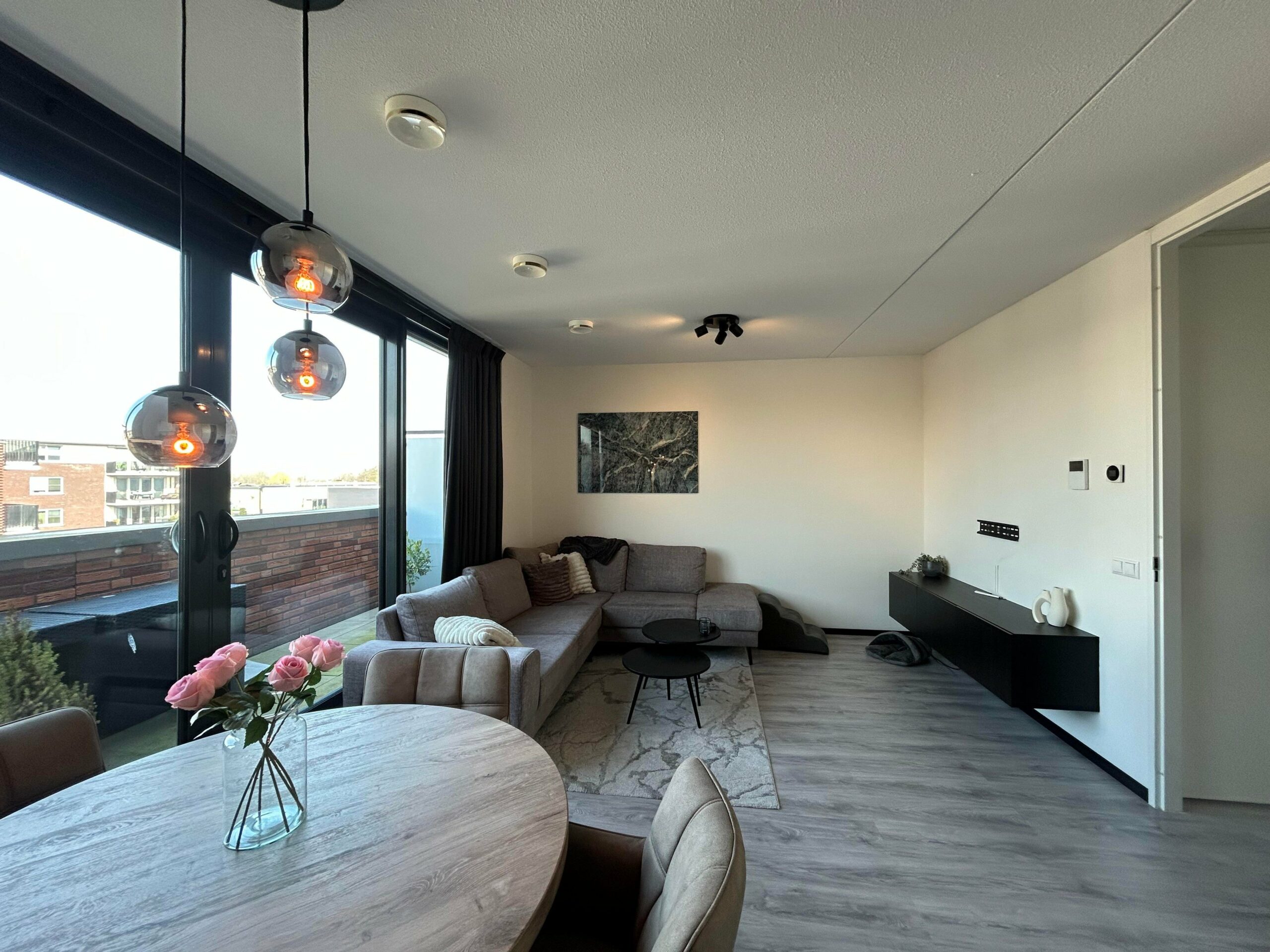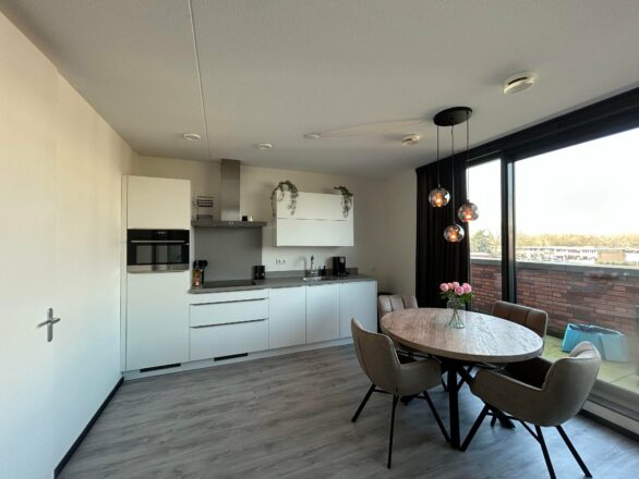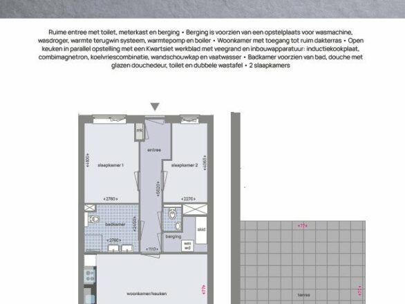 De berging is voorzien van een opstelplaats voor wasmachine, wasdroger, warmte terugwin systeem, warmtepomp en boiler. Bij de woonkamer heeft u toegang tot het balkon. Er is een open keuken met een Kwartsiet werkblad met veegrand en inbouwapparatuur: inductiekookplaat, combimagnetron, koelvriescombinatie, wandschouwkap en vaatwasser. De badkamer is voorzien van bad, douche met glazen douchedeur, toilet en dubbele wastafel. Ook zijn er 2 slaapkamers.
