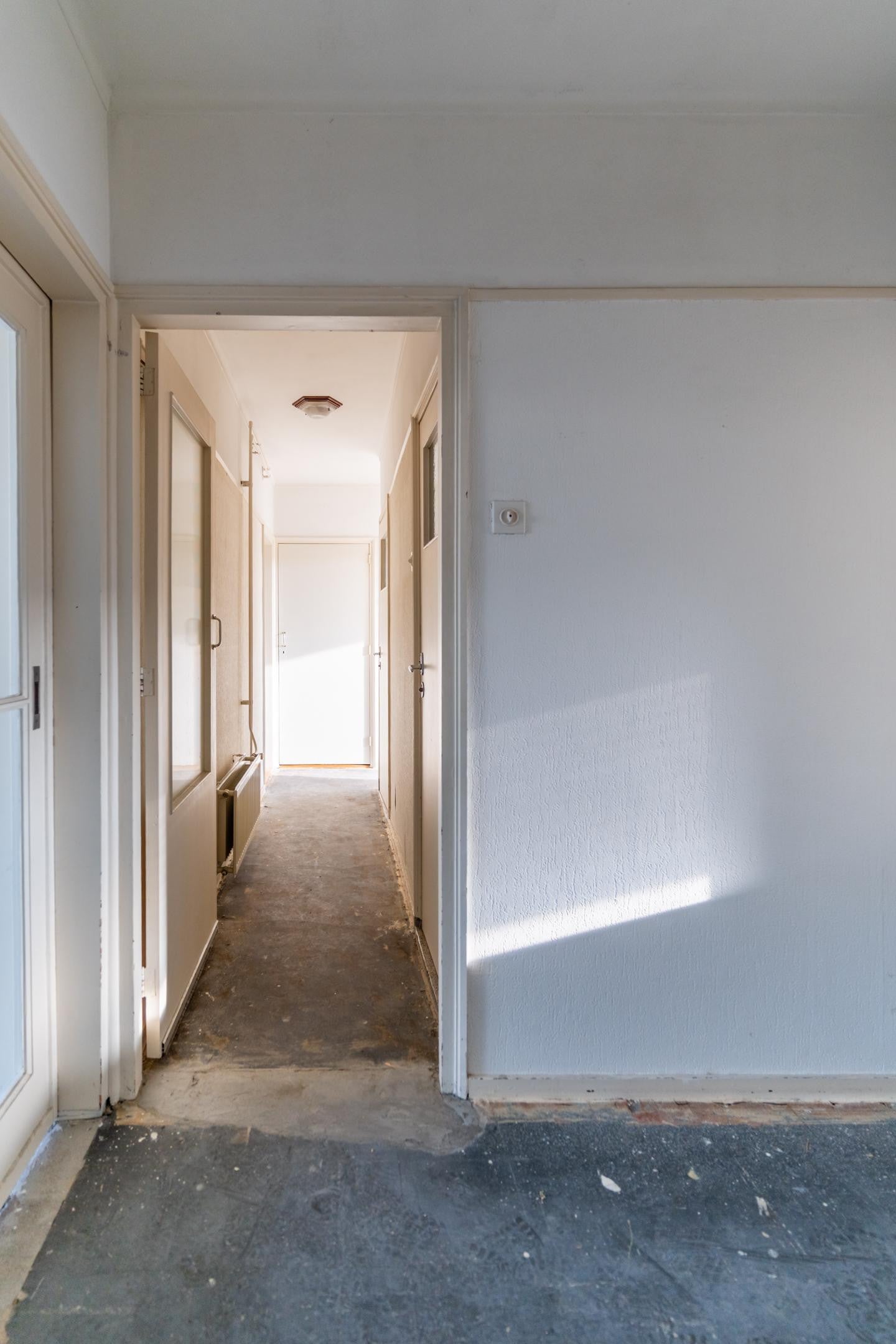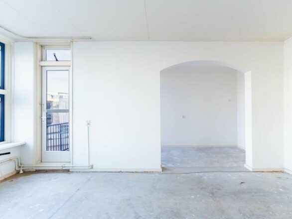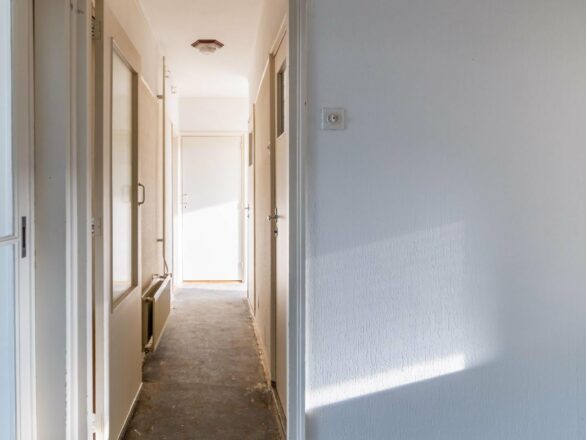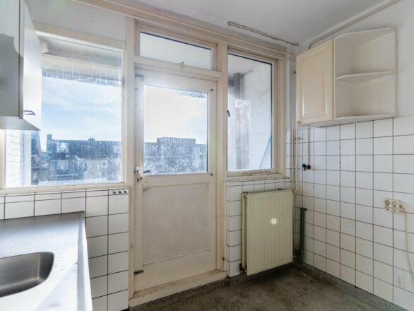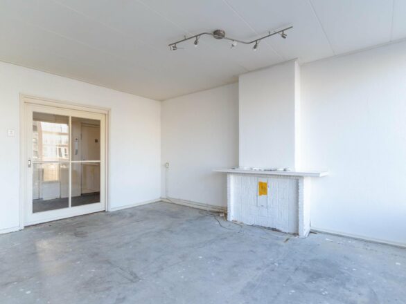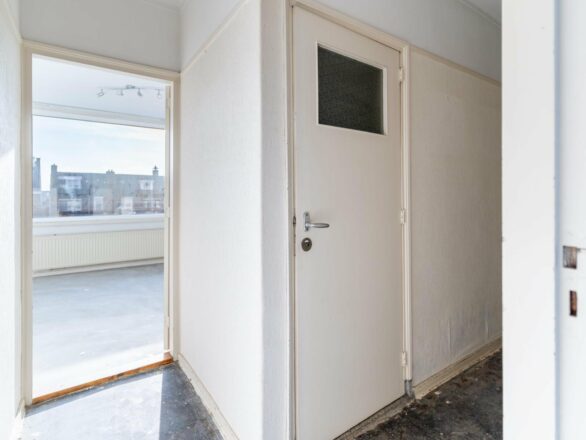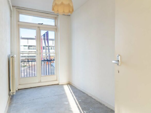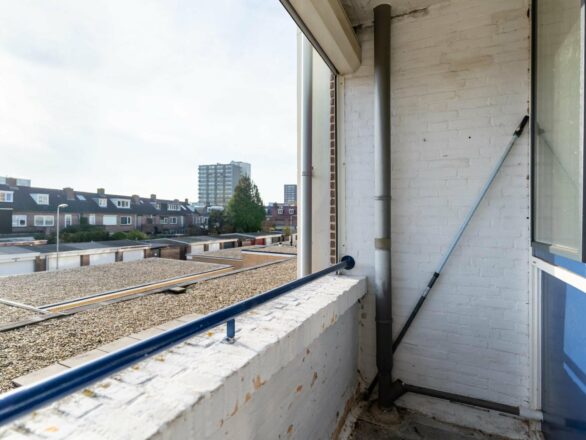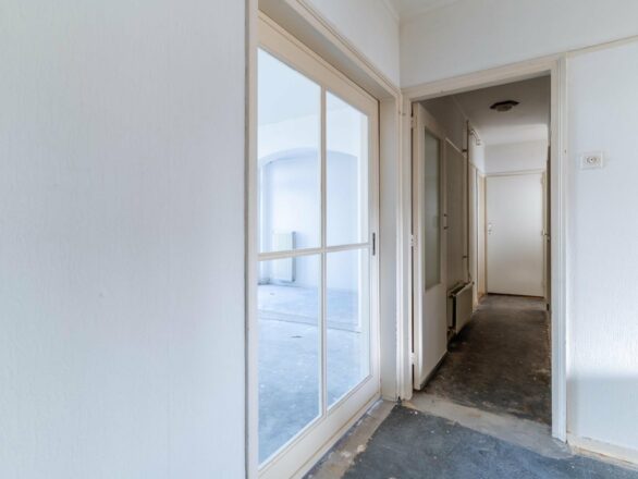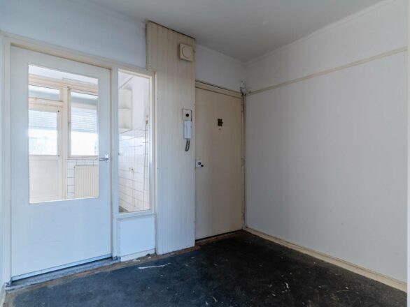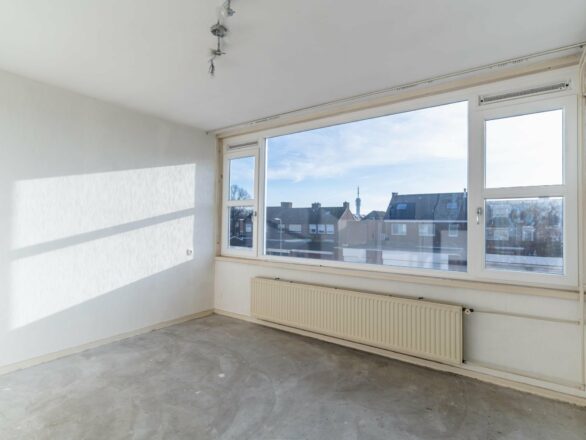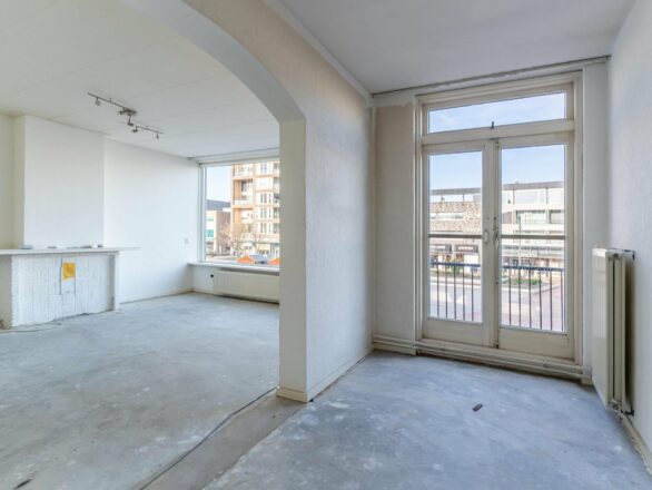 Via de gezamelijke portiek, is het appartement te vinden op de derde etage. Hierbij komt u eerst binnen in de hal die u toegang verleent tot alle kamers.De woonkamer beschikt over grote ramen die veel natuurlijk licht binnenlaat. De woonkamer heeft een deels open keuken zonder apparatuur, uiteraard is hier wel ruimte voor. Via de hal bevindt zich ook het aparte toilet.
