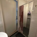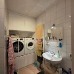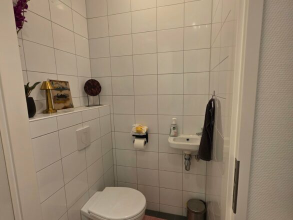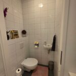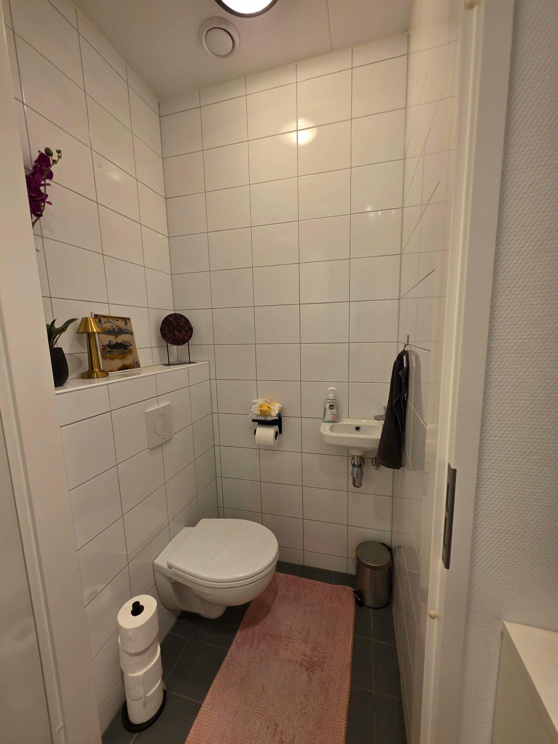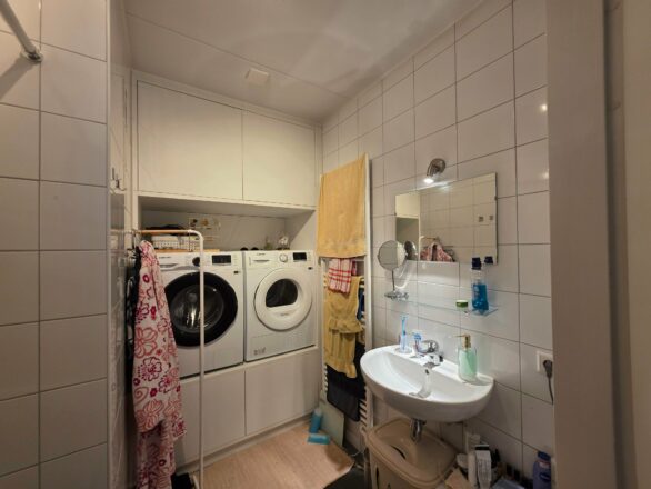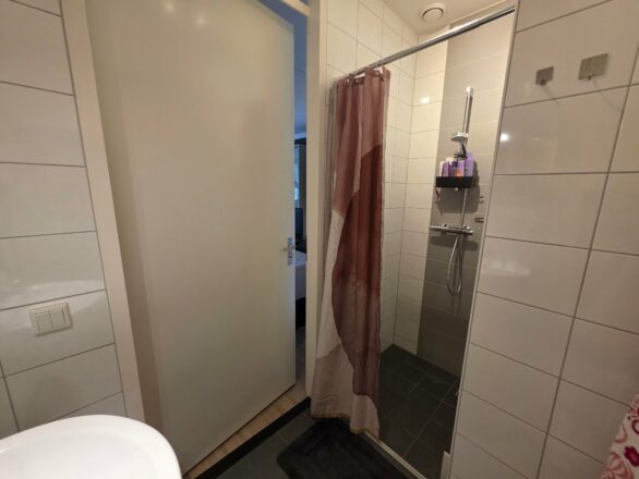 De badkamer is uitgerust met wastafel, spiegel, en douche. Tevens bevindt zich hier ook de aansluiting voor de wasmachine.
