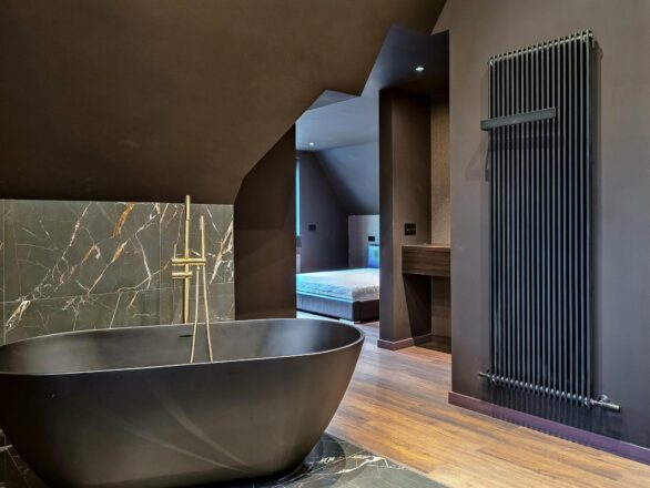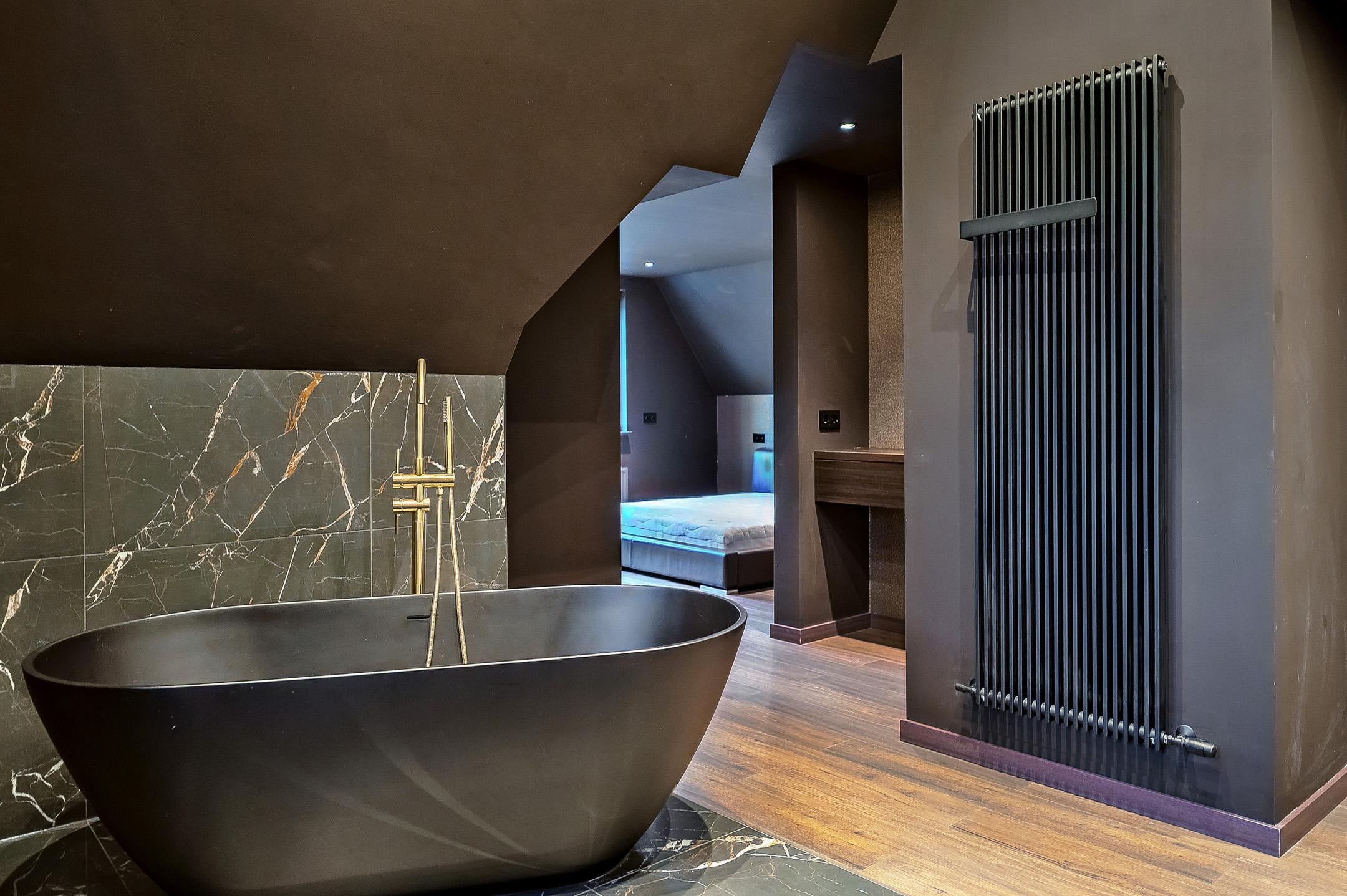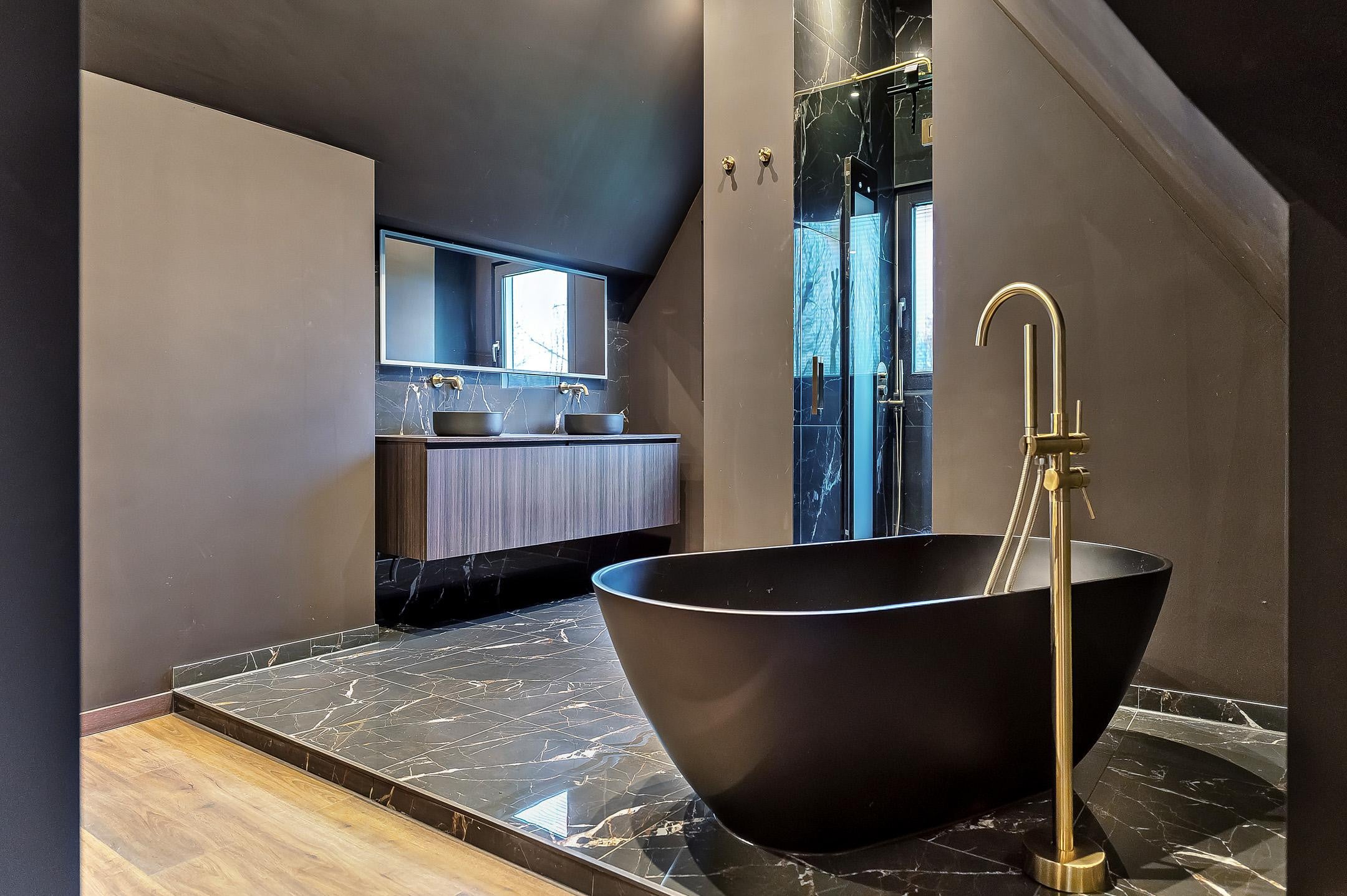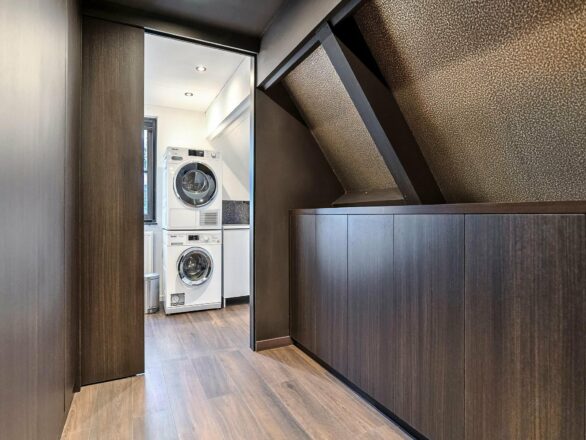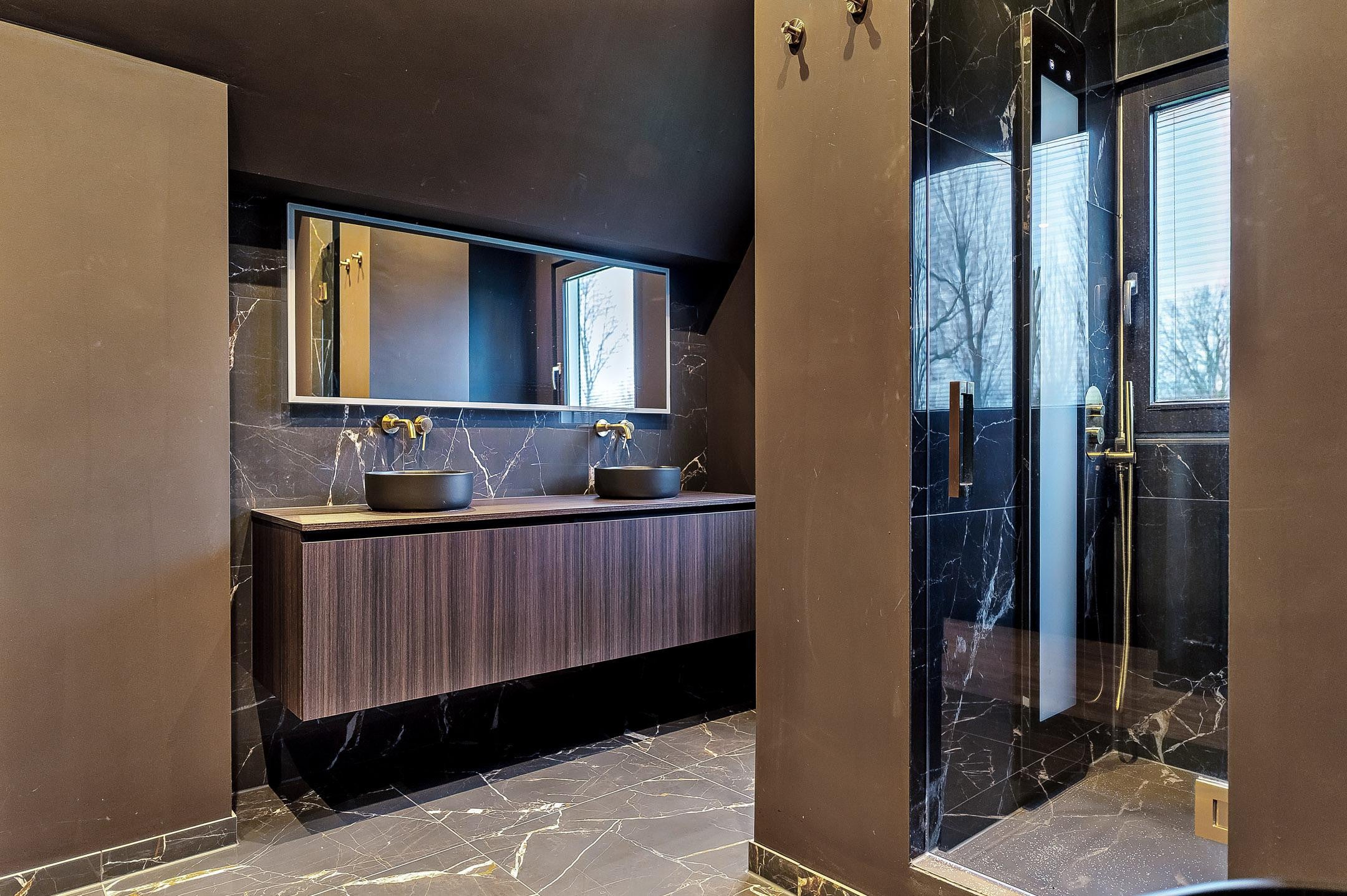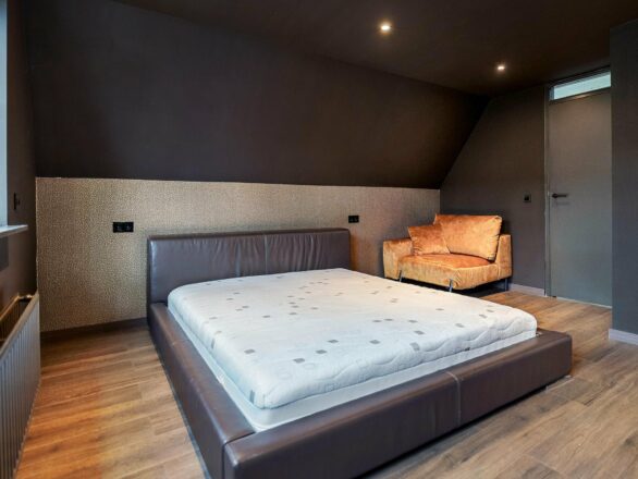 Op de eerste verdieping zijn twee slaapkamers gesitueerd, waarvan één volledig gerenoveerd met luxe badkamer en suite voorzien van vloerverwarming, wasruimte en royale kastruimte. Tevens bevindt zich op de eerste verdieping een apart toilet.